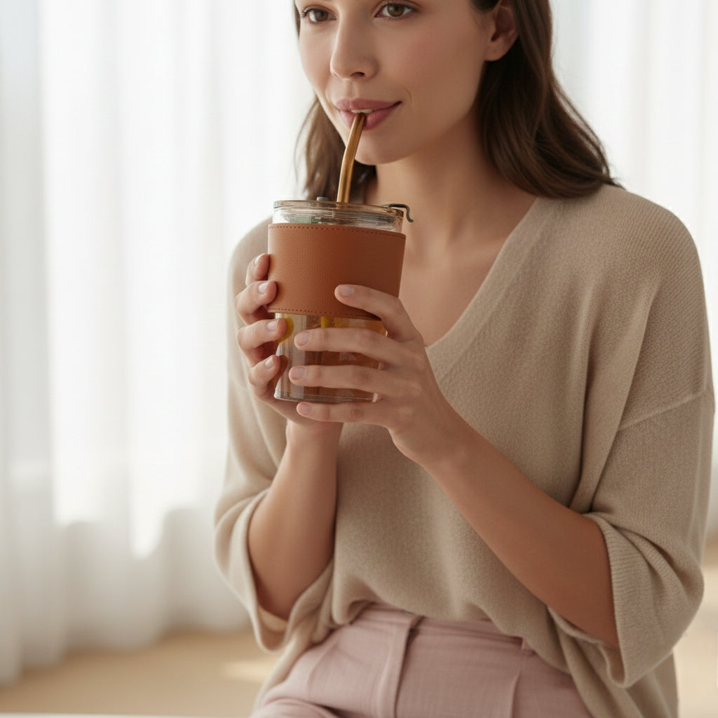 Crafted from high-quality glass, it keeps your drinks fresh and pure, free from any plastic taste. The sipper comes with a matching glass straw, offering a refined and eco-conscious drinking experience. The soft, anti-slip grip sleeve ensures a comfortable hold, while the secure lid makes it suitable for everyday use at home, work, or on the go.